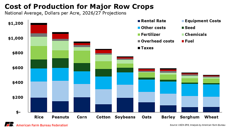 - Per-acre production costs for all nine principal row crops are projected to rise again in 2026, continuing a troubling trend that began after 2021.